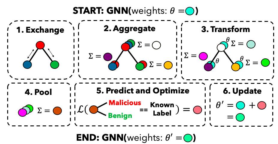 At a semi-formal technical level, GNNs work by exchanging, aggregating, and transforming messages passed between all nodes and their respective neighbors. When combined with neural networks, GNNs are able to learn complex non-linear high-dimensional representations for a node with respect to its k-hop neighborhood by iteratively passing messages k times. When all node representations are pooled together, a representation for the graph can be derived that theoretically captures both the structure and behaviour of the entire program. This representation can then be passed to a classifier to make a final prediction.