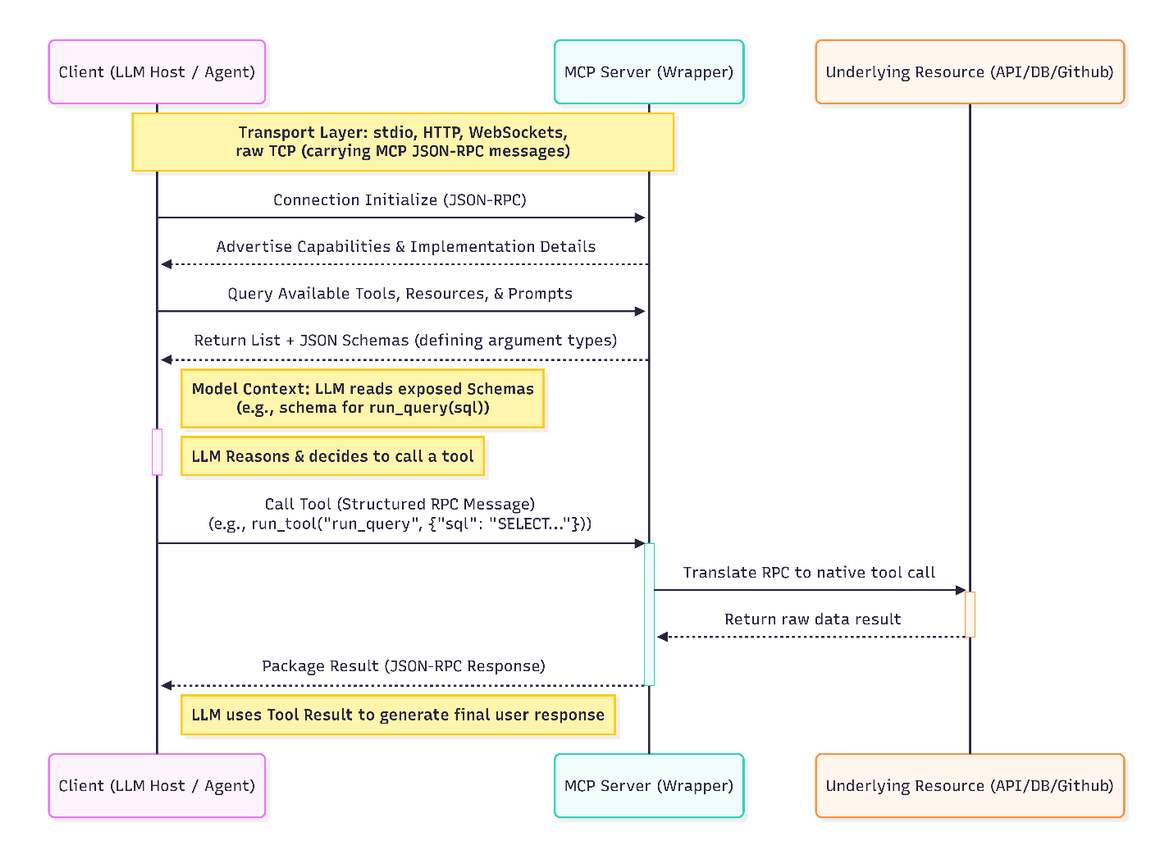MCP is built on top of JSON-RPC 2.0 and uses a simple architecture: a client (the LLM host or agent system) connects to a server (a wrapper around tools or resources). Communication happens over standard channels such as stdio and Streamable HTTP, and implementations can optionally add custom transports (for example, WebSockets or raw TCP) as long as they carry MCP JSON-RPC messages. [5] When the client initializes the connection, the server advertises its capabilities and implementation details. The client then queries the server for the available tools, resources, and prompts, including their schemas, so the model can decide what to call. The LLM can then call these tools using structured RPC messages.