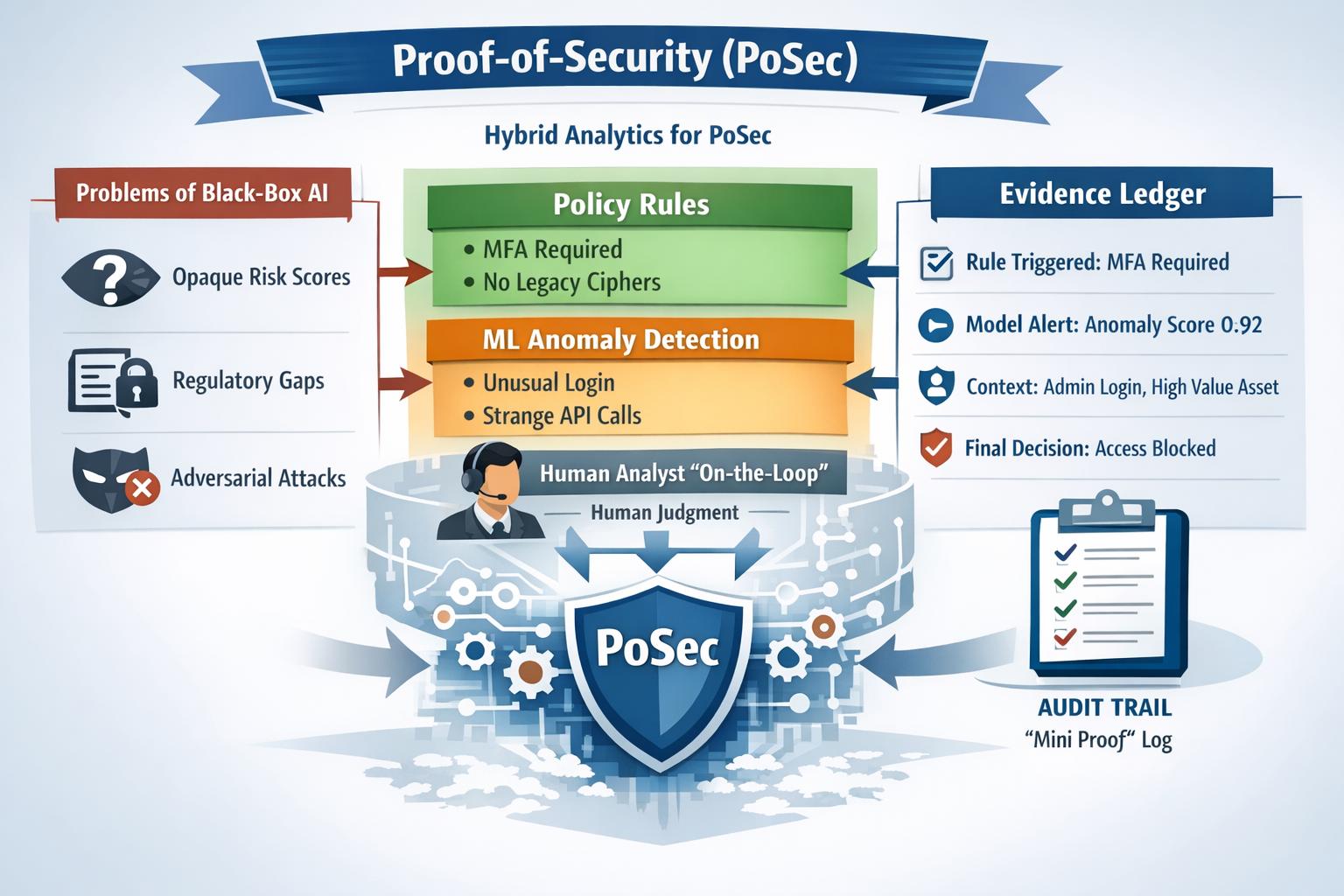 Proof-of-Security (PoSec) reframes “AI for cyber defense” from chasing detection accuracy to producing decisions that can be explained and audited. It argues black-box models fail in practice because they obscure risk posture, create compliance gaps (e.g., traceability expectations in NIST guidance), and remain fragile to adversarial manipulation especially as attackers weaponize AI. PoSec instead uses hybrid analytics (deterministic policy rules + ML anomaly detectors + humans on-the-loop) where combination logic is explicit and rules can dominate high-severity cases. An evidence ledger then logs which rules/models fired, key context, and the final action, turning each alert into a reconstructable “mini proof” suitable for operations and audits.